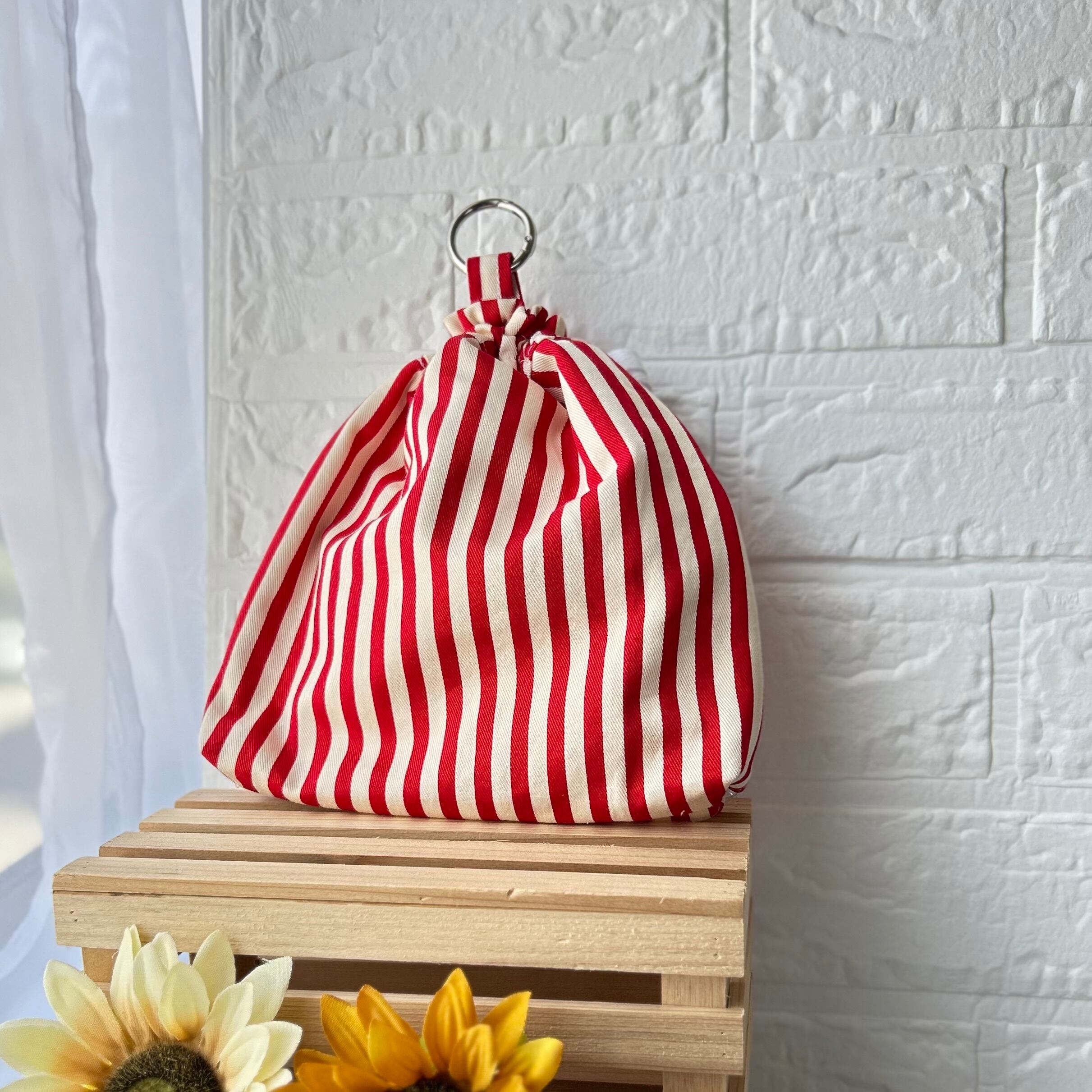 カラビナ付き。赤白ストライプのぬい用巾着ポーチ
